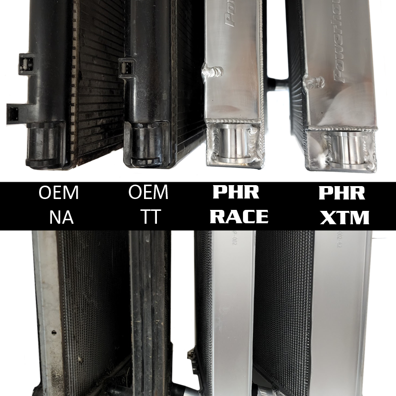 Here is a side by side of PHR's Race Radiator and XTM Race Radiator in comparison to OEM Non-Turbo and OEM Twin Turbo radiators. You can see the sizable difference in PHR vs OEM, with the XTM being largest for use where extreme cooling is needed.